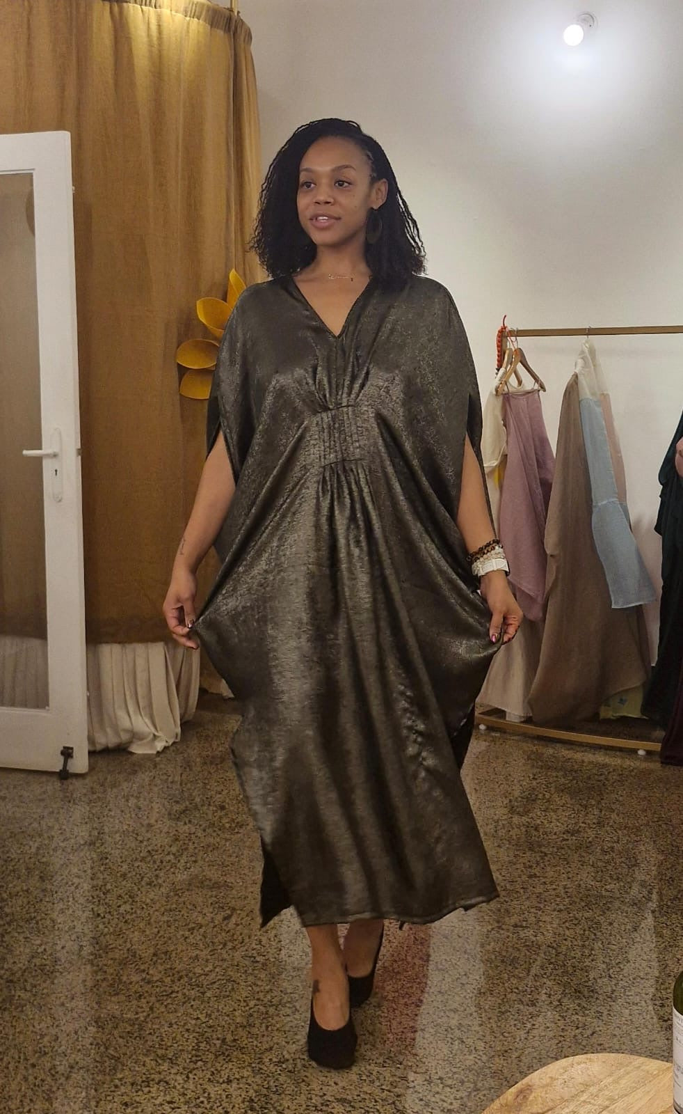 Effortlessly elegant and designed to make a statement, this shimmer crepe tapered kaftan blends fluid movement with refined glamour.