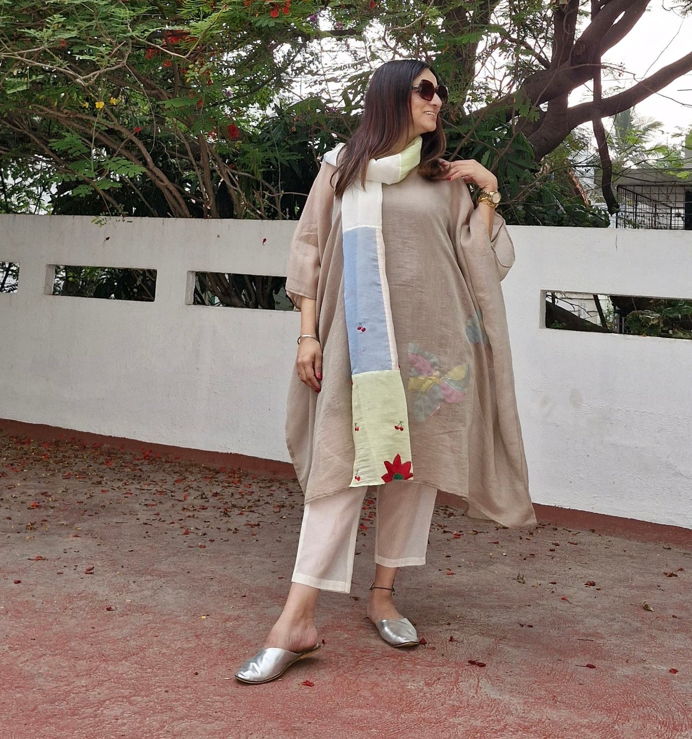This elegant sand-toned ensemble using breathable Chanderi fabric, is designed with a relaxed silhouette and a fluid drape that offers comfort and timeless appeal. Rooted in sustainable fashion, the design reflects mindful craftsmanship and slow-made detailing, making it a conscious addition to a modern wardrobe.