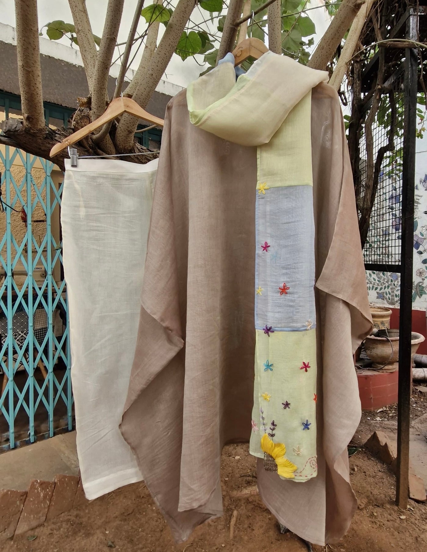 The outfit is delicately adorned with handcrafted organza flower accents, adding subtle texture and depth. Paired with coordinating pants featuring an intricate embroidered patch, the ensemble balances artisanal detailing with everyday wearability. Versatile and refined, it is perfect for intimate gatherings, relaxed celebrations, or elevated daily dressing.