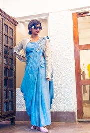 A contemporary pre draped saree crafted in rugged denim featuring a modern lower-pallu silhouette. The saree is elevated with refined patchwork detailing on the pallu, adding depth and texture.