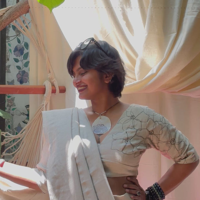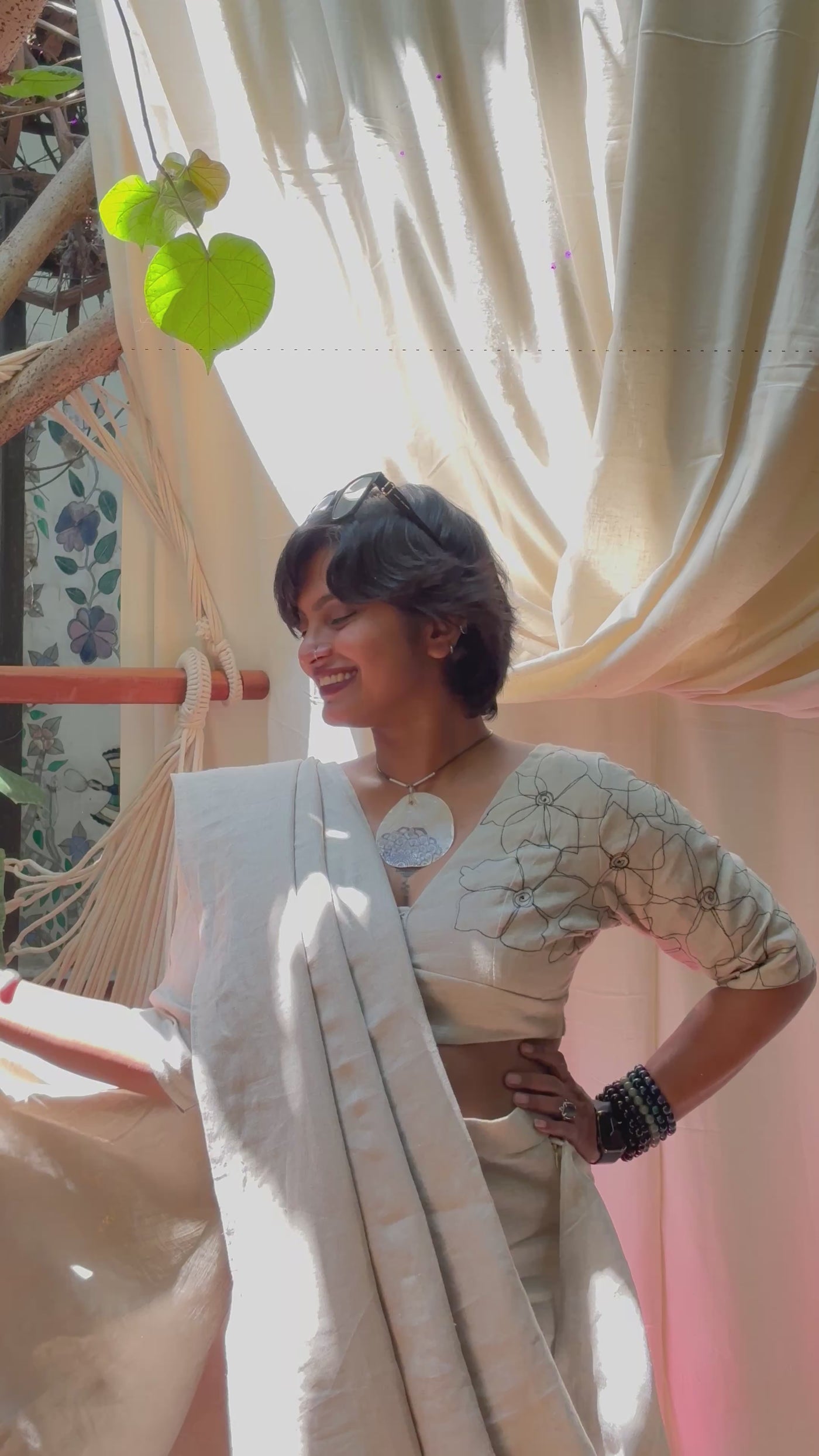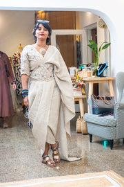 This pre draped saree with dhoti style dress is crafted from breathable linen fabric, it offers comfort, structure, and a refined drape that’s easy to wear.
