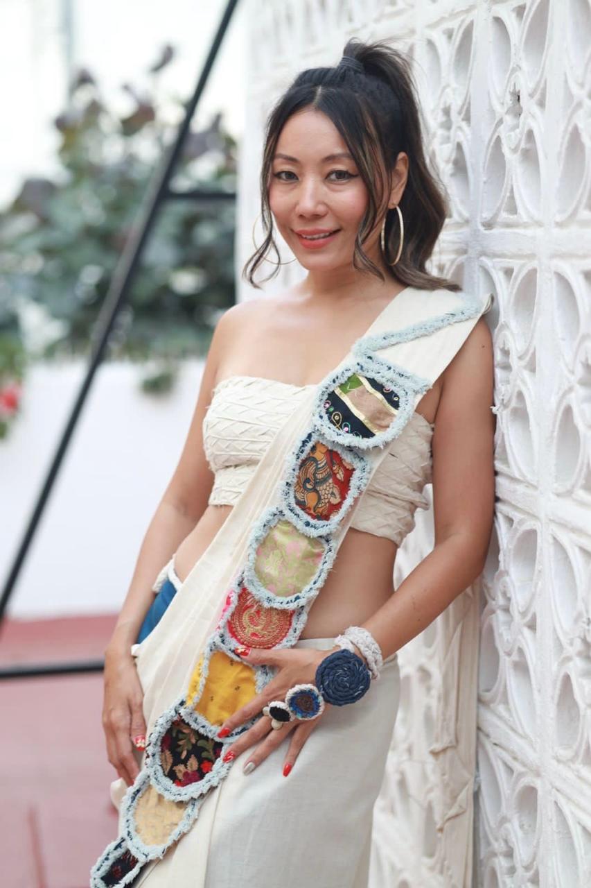 Paired with a modern crop top and fitted pants crafted from comfortable denim lycra fabric, this pre-draped khadi saree blends structure, ease, and artistic expression.