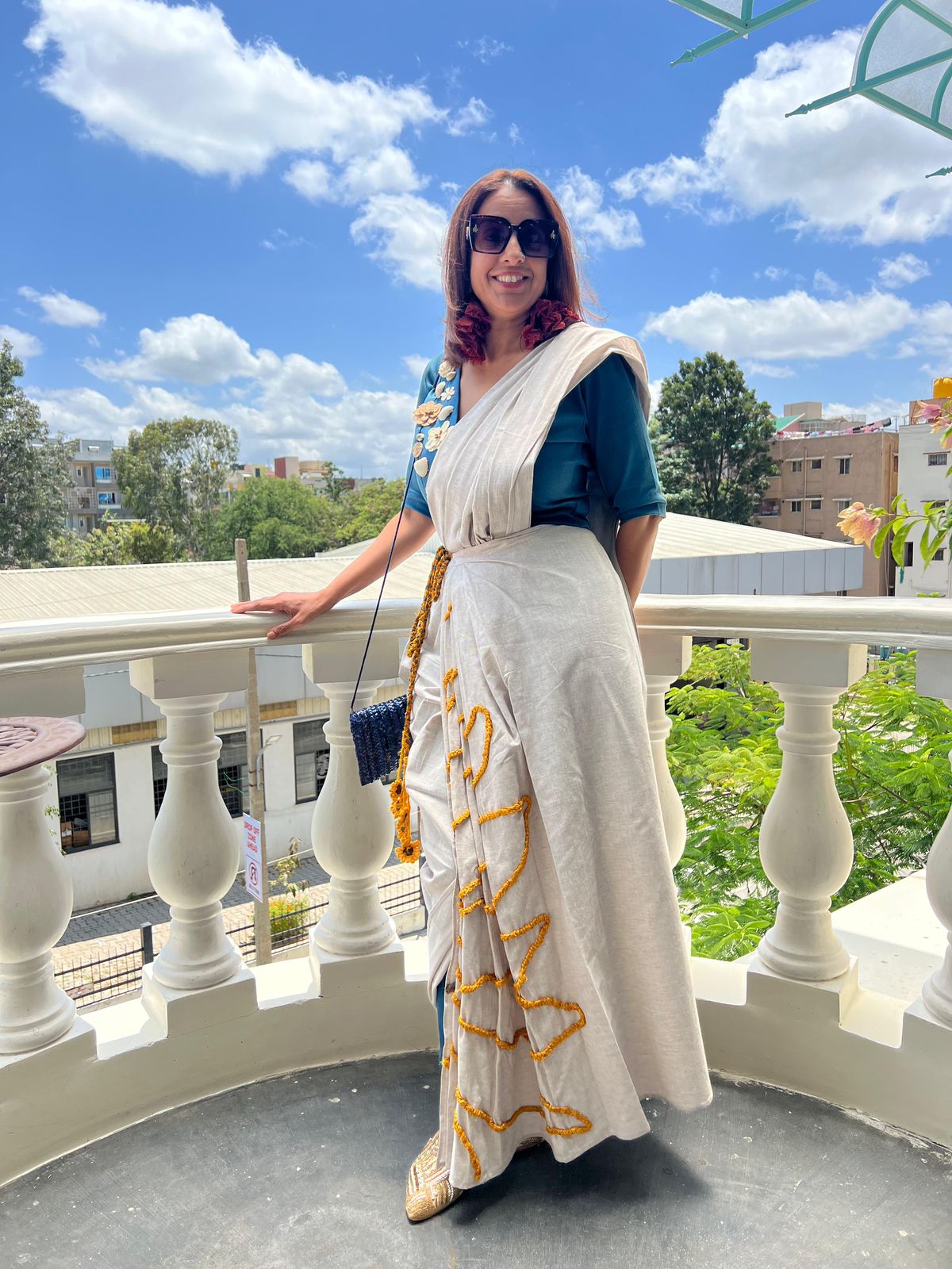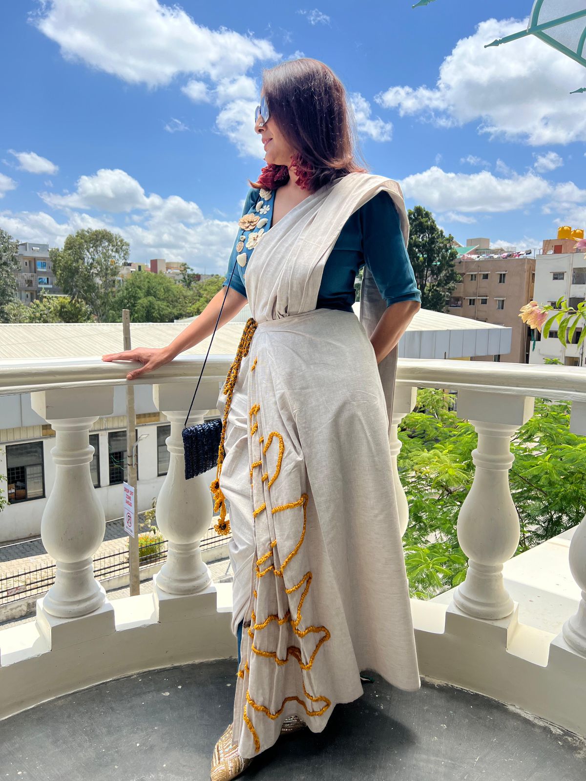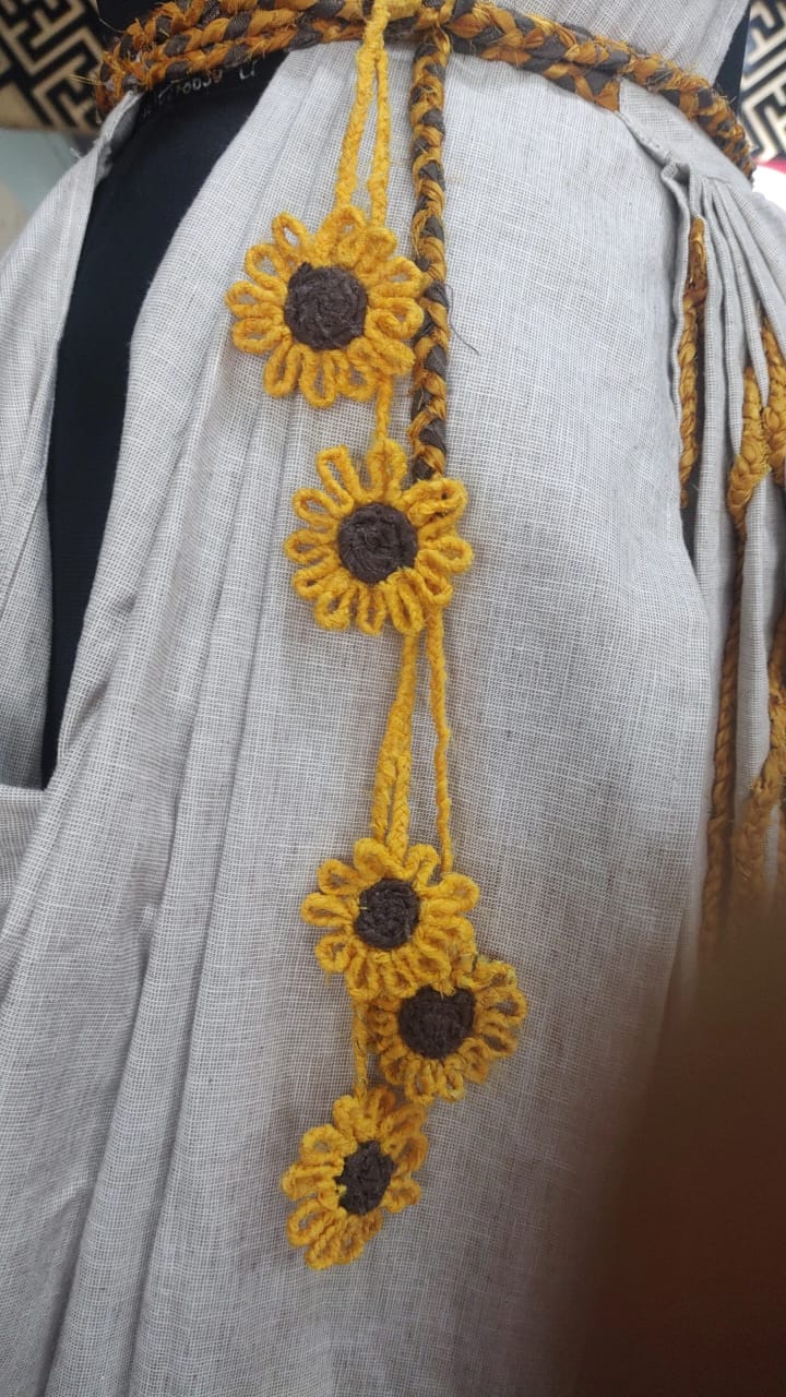 This pre-draped Khadi saree is a contemporary expression of handcrafted elegance and modern comfort. Designed for effortless wear, the saree features beautifully structured pleats highlighted with a unique hand-braided sunflower detail, adding an artisanal touch to the silhouette.