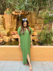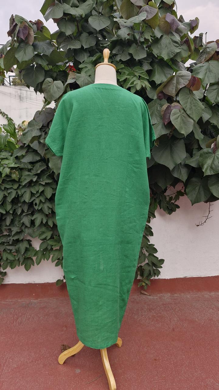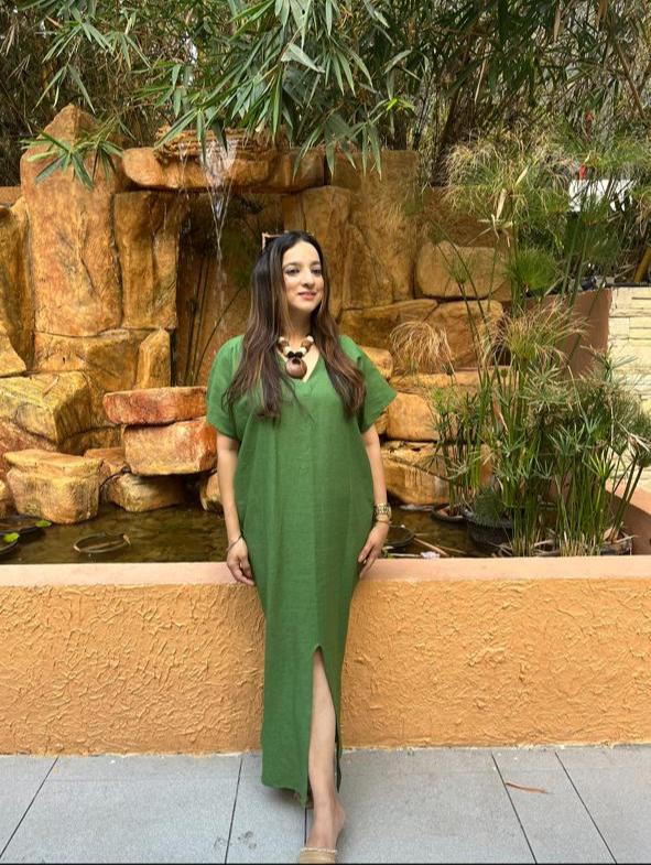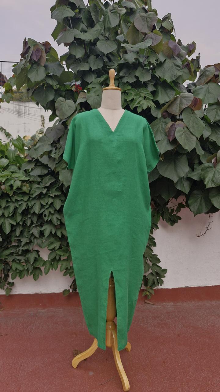 Crafted in premium linen fabric, the dress delivers natural breathability, comfort, and a structured yet relaxed finish—perfect for long evenings and elevated occasions. Soft cowl detailing adds dimension and grace, while the tapered hem and subtle slit create ease of movement and a sculpted, feminine shape.